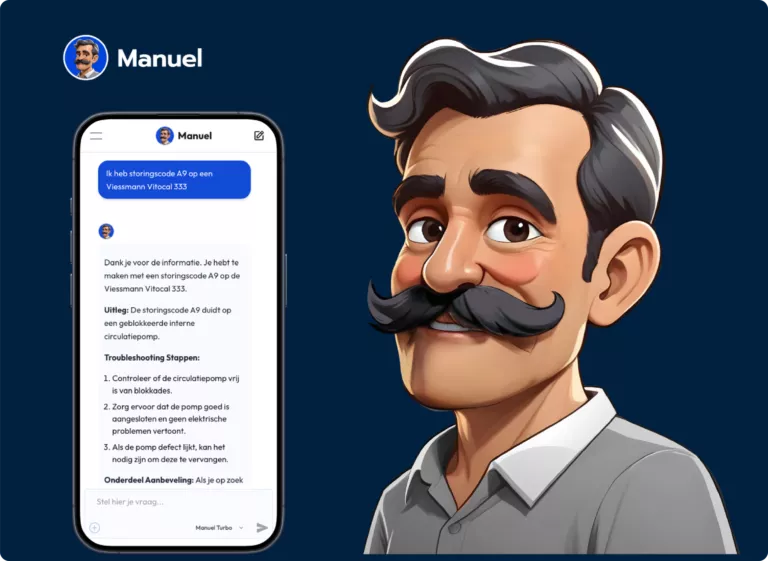 Wat Manuel dan precies aan ondersteuning biedt? Boris: “Stel je bent bij een klant en installeert een warmtepomp. Je hebt een vraag over het merk/product of krijgt een foutmelding bijvoorbeeld. Via WhatsApp stel je een specifieke vraag aan Manuel. Manuel zoekt naar het antwoord en leest ieder documenttype. Of het nu een handleiding van driehonderd bladzijden is of een staafdiagram. Vervolgens presenteert hij je het antwoord.”
